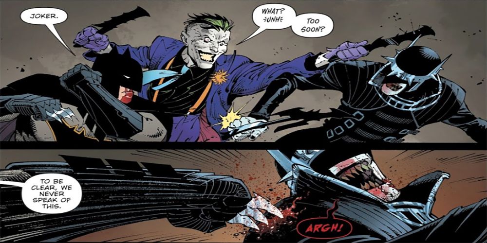 El Batman que rÃe y el Caballero Grim fueron en busca del Guasón, aparentemente buscando matarlo. El PrÃncipe Payaso del Crimen escapó y formó una pequeña alianza con Batman para enfrentarse a la pareja.