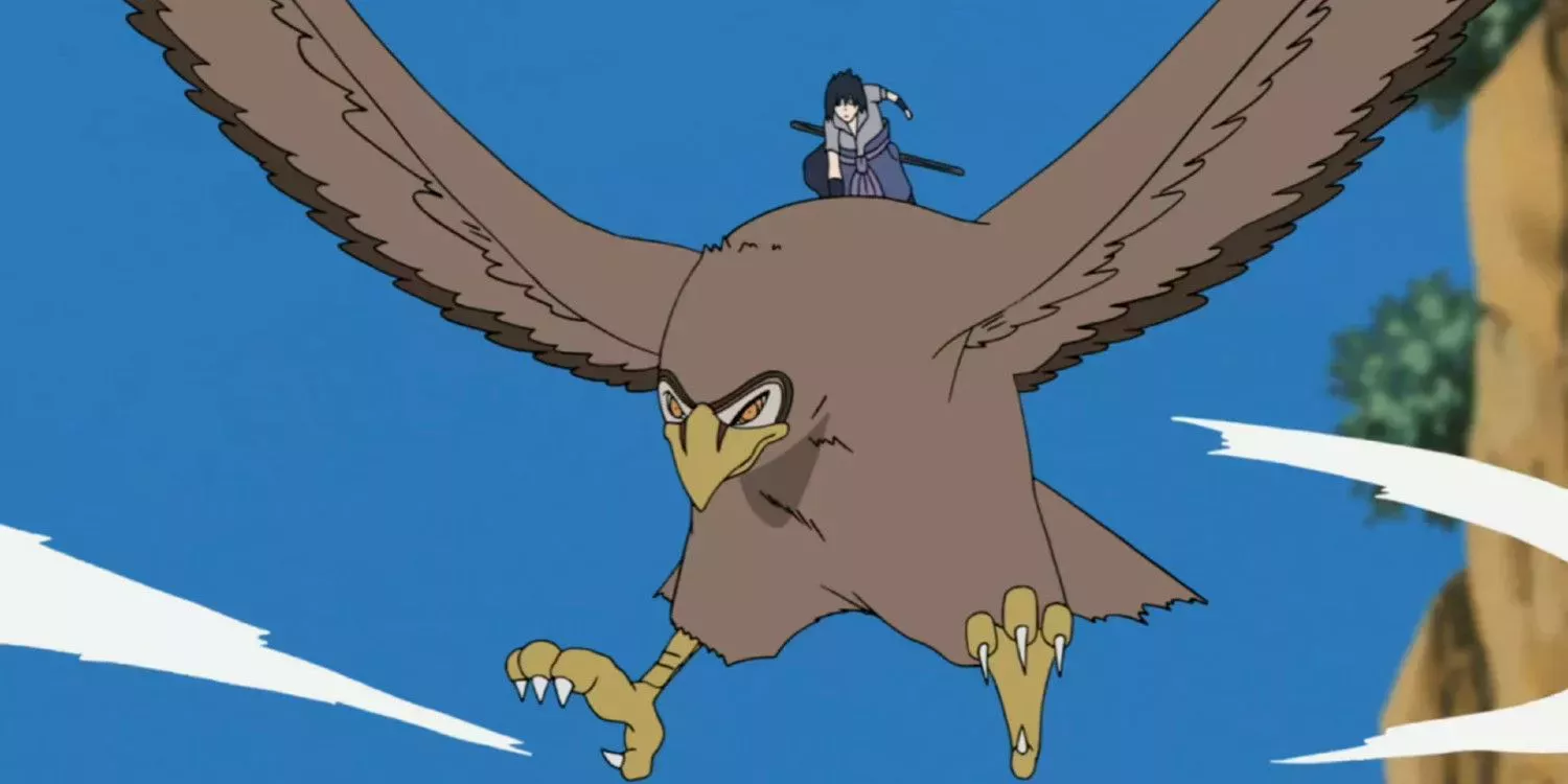 Normalmente invoca a las serpientes por las que adquirió afinidad mientras aprendía con Orochimaru, pero mientras luchaba contra Danzo, Sasuke invocó a un halcón gigante que después utilizó con moderación. Garuda no volvió a aparecer hasta el final de la Cuarta Gran Guerra Ninja, cuando fue invocado de nuevo en la batalla contra Kaguya. Con dos invocaciones contra una de Naruto, Sasuke definitivamente le gana en ese departamento.