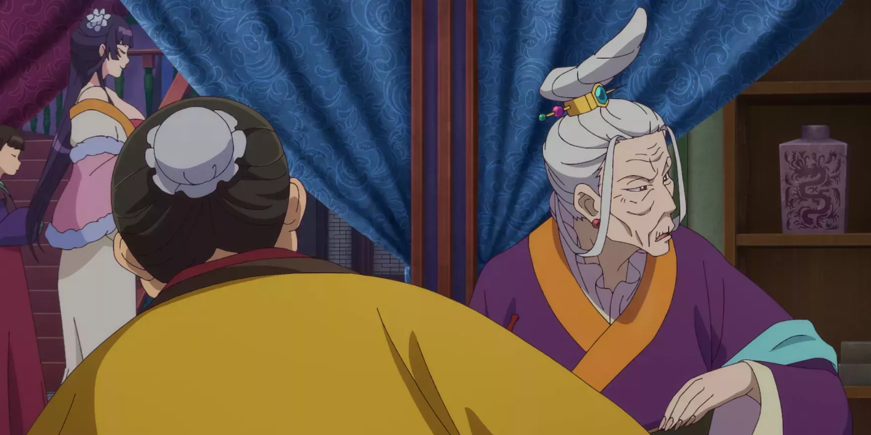 A lo largo de la serie, la relación de Maomao con la abuela es un poco confusa. En cualquier otro caso, Fengxian probablemente habría sido arrojada a la calle, e incluso se menciona que su embarazo y su enfermedad casi llevaron a la Casa Verdigris a la bancarrota. Como antes no podía trabajar a un nivel tan alto y parecía haber optado activamente por no poner fin a su embarazo, Fengxian era, en última instancia, menos valiosa.