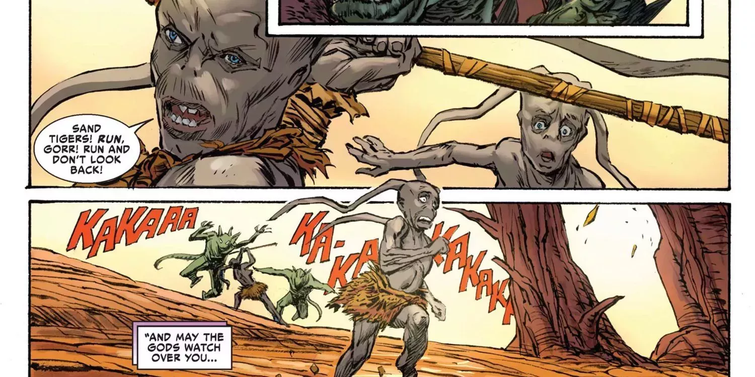 Cuando Marvel Studios publicó el primer aspecto de Christian Bale como Gorr, los fans de Marvel de todo el mundo se quejaron de lo mismo: su falta de características alienígenas. El Gorr del MCU parece un humano, excepto por su piel. El homólogo de Gorr en los cómics es obviamente de una raza menos humanoide. Su rostro es reptiliano. No tiene nariz, ni labios, y tiene dientes afilados.