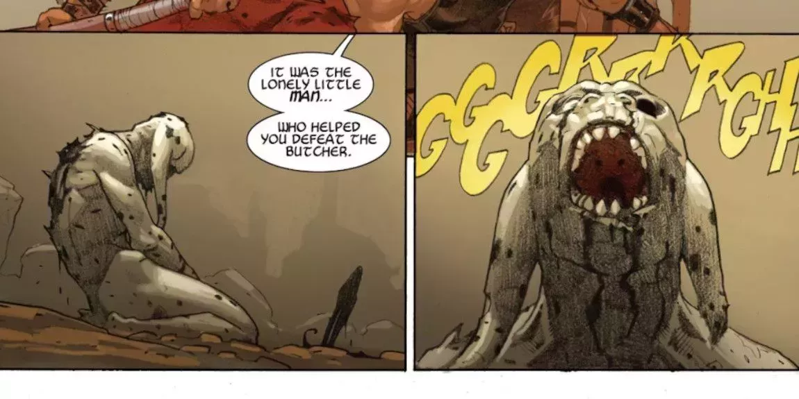 Curiosamente, el Gorr de Bale no recuerda mucho a su homólogo de los cómics. No sólo físicamente, sino que también da una sensación muy diferente. El Gorr de Bale es más espeluznante. Se esfuerza por dar miedo y juega con sus víctimas. La representación de Jason Aaron es una criatura más tiránica y bestial, con una naturaleza violenta inherente que Bale convirtió en una maldad imperturbable.