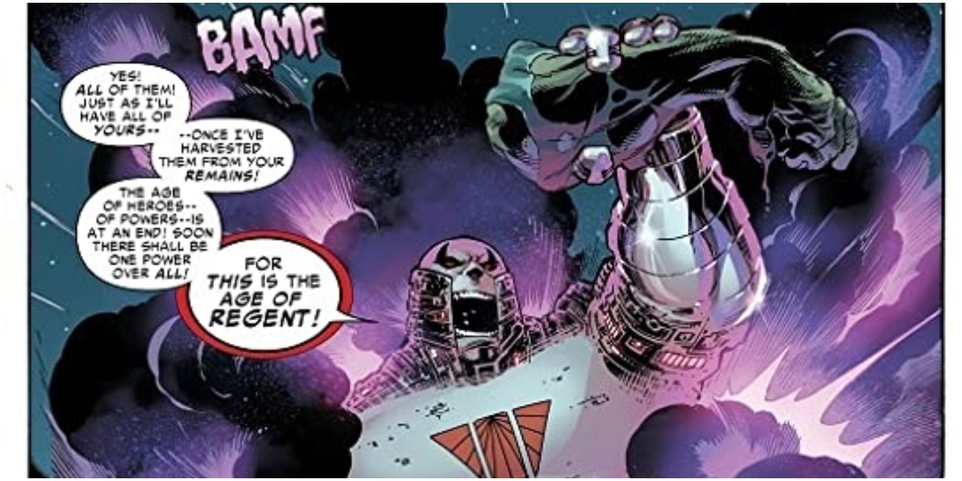 Después de que las Guerras Secretas devastaran el multiverso, el Dios Emperador Doom utilizó los restos de los mundos que se colapsaban para crear Battleworld. Entre los dominios estaba Regency, llamado así por el tirano Regente que lo conquistó. No está claro cómo el Regente se enteró de la existencia de Doom, pero está claro que no lo subestimó.