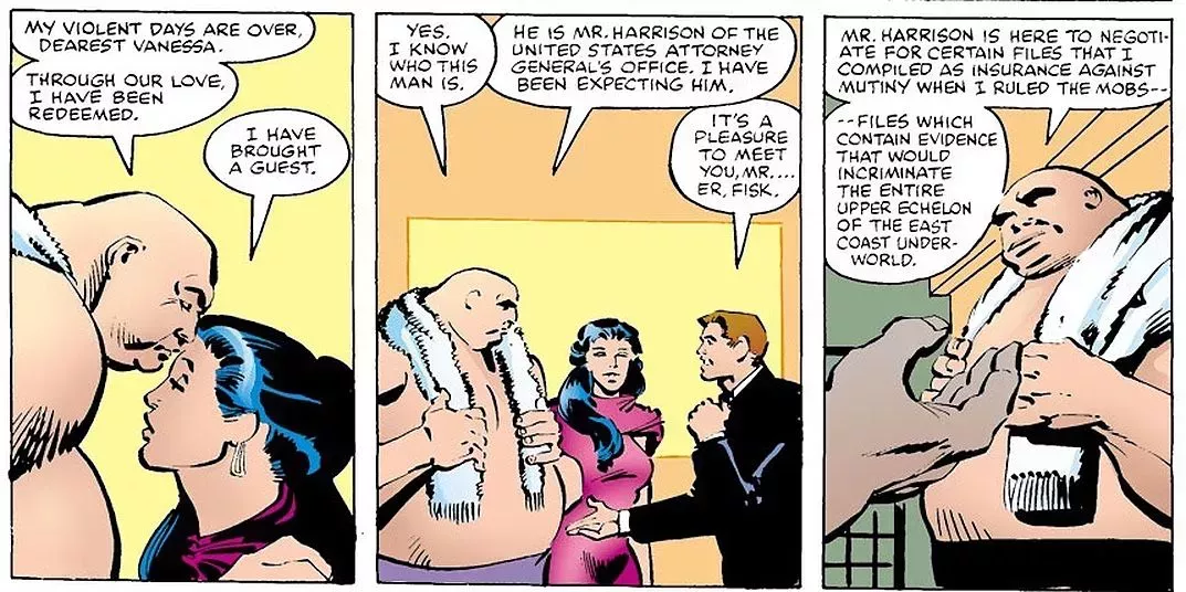 Kingpin fue concebido originalmente como una némesis clave para Spider-Man, por lo que es un testimonio de la influencia de estos cómics que el personaje es visto principalmente como un villano de Daredevil ahora. La serie de Miller comenzó con Wilson Fisk retirado de su vida criminal. Instalado en una mansión japonesa con su esposa, Vanessa, los Fisk pronto desarrollarían una de las relaciones más intrigantes del cómic. Sin embargo, en esta primera etapa, Vanessa Fisk queda reducida al manido tropo de la esposa que actúa como brújula moral del gángster. Y lo que es peor, el éxito de su rehabilitación es, de alguna manera, responsabilidad exclusiva de ella.
