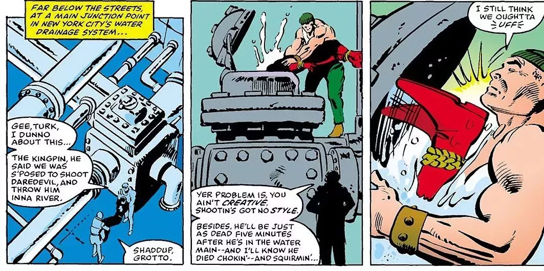 Sin embargo, esto abrió toda una nueva lata de gusanos, ya que a menudo se requerían razones artificiales para que Daredevil sobreviviera a una batalla, incluso después de haber quedado inconsciente. Daredevil Vol. 1 #171 presenta una escena particularmente ridícula en la que los secuaces de Kingpin deciden ahogar a DD en lugar de dispararle, simplemente porque es más elegante.