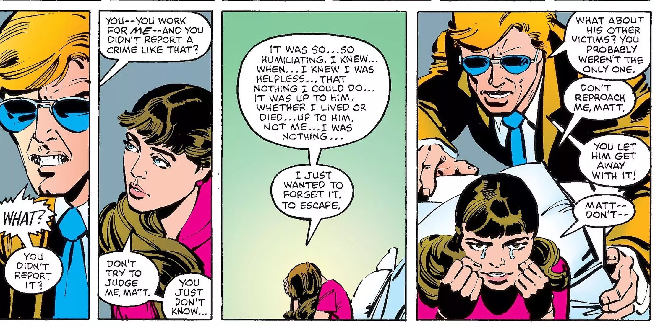 Por un lado, el Comics Code impedía tratar estos temas de forma explícita, lo que llevaba a los creadores a utilizar eufemismos reductores. Por otro, los personajes "heroicos" a menudo tomaban decisiones cuestionables, como en este panel de Daredevil Vol. 1 #173, en el que Matt Murdock responsabiliza a una superviviente de una agresión de que su agresor quede libre.