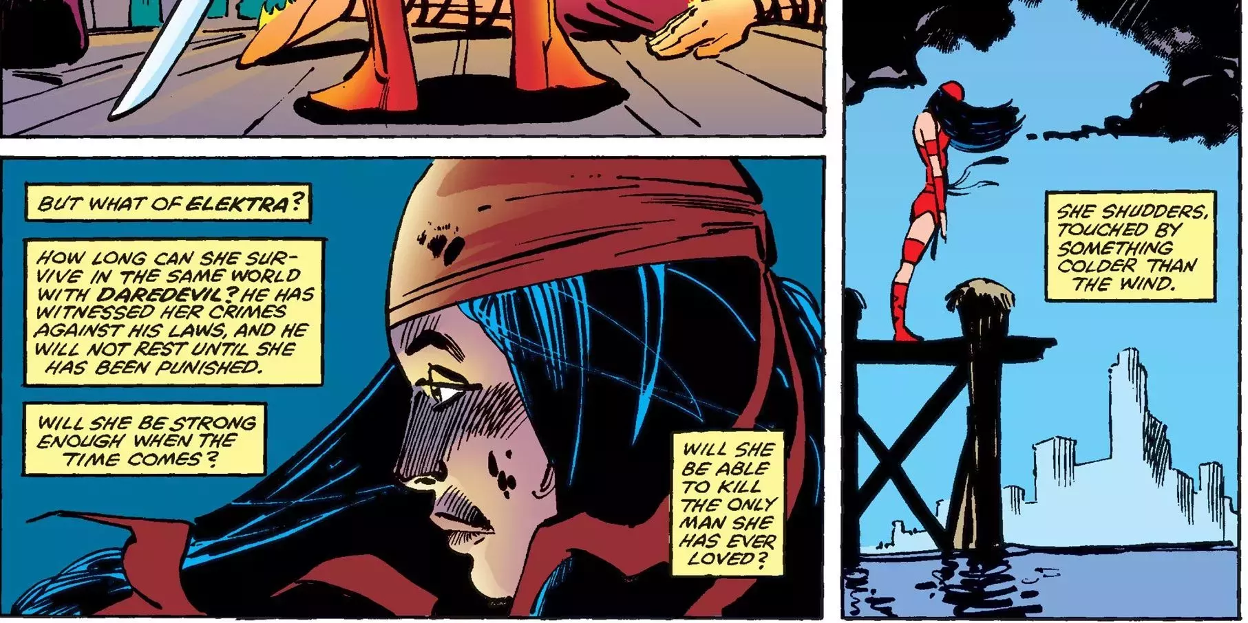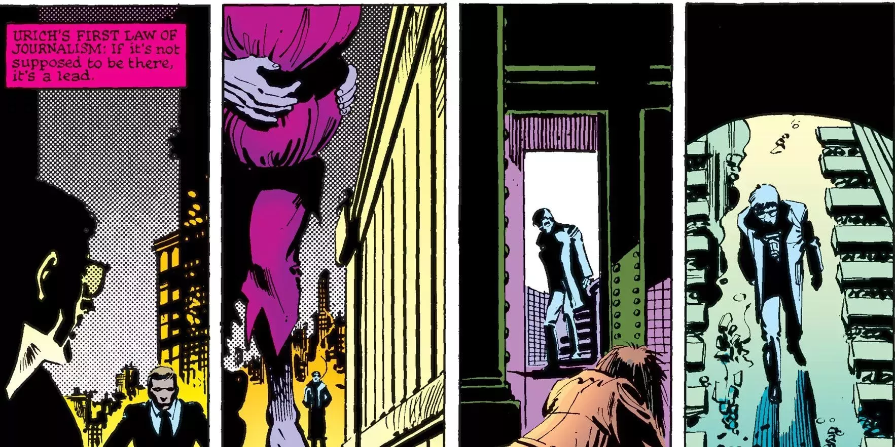 Sin embargo, Miller a menudo tomaba prestados los peores rasgos de las novelas policíacas pulp, lo que a veces daba lugar a un texto dolorosamente exagerado. Por ejemplo, esta secuencia de Daredevil Vol. 1 #176 termina en realidad con la frase "se estremece, tocada por algo más frío que el viento".