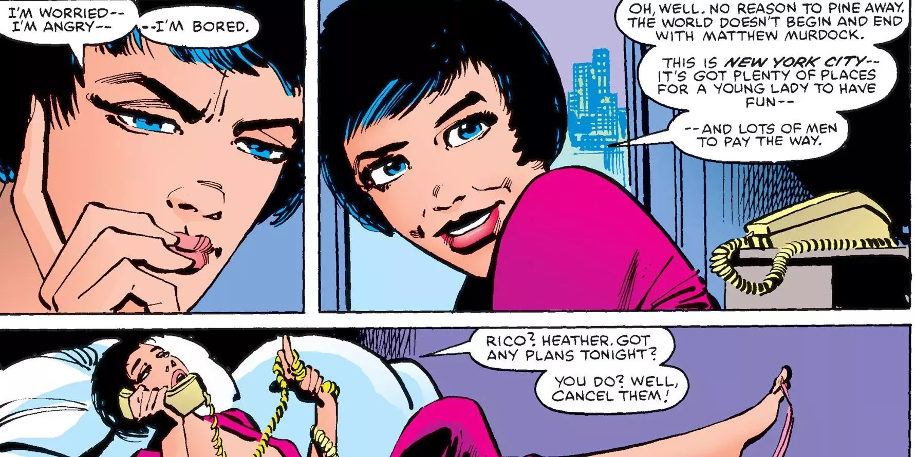 La relación de Matt Murdock con Heather Glenn fue tratada como una tediosa carga narrativa durante la carrera de Miller en Daredevil. Todo el papel de Heather consistía en enfadarse con Matt, perdonarle inexplicablemente por evitarla y sacar a relucir el hecho de que le parecía muy sexy salir con un superhéroe.