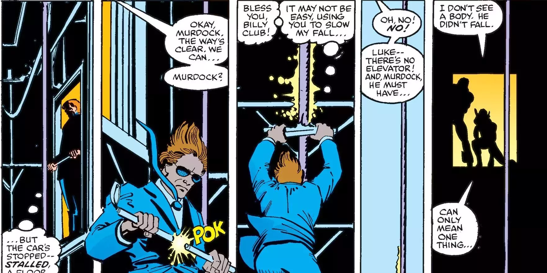 Cuando a Matt Murdock le asignaron a Power Man (Luke Cage) y a Puño de Hierro como guardaespaldas, cambiar a su alter-ego fue de repente increíblemente difícil. Naturalmente, la única forma en que Matt podía resolver este problema era metiéndose en el hueco de un ascensor.