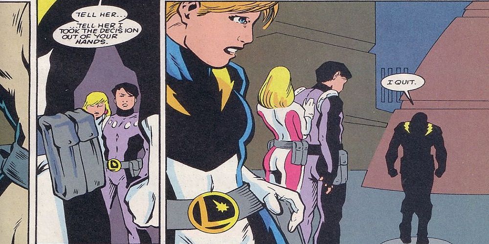 El Chico Relámpago ha dejado la Legión varias veces. Sin embargo, uno de los casos más notables de esto es al principio de la formación del equipo de la Hora Post Cero. Allí, mientras que RJ Brande pretendía tenerlo como uno de los principales miembros del equipo, la regla de la Legión de tener un miembro de cada planeta lo ha reemplazado por Ayla, su hermana. Sin embargo, después de descubrir la ubicación de su hermano Mekt, eligió dejar el equipo y permitir que Ayla se quedara con la esperanza de localizarlo una vez más.