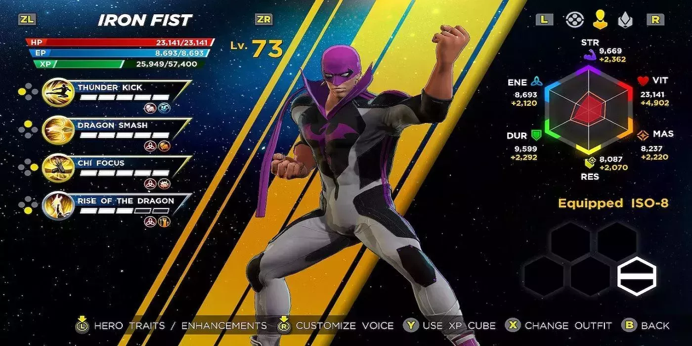 Puede que Iron Fist tenga uno de los pocos trajes exclusivos del juego. Al derrotar a Elektra en la dificultad Superior, el artista marcial y multimillonario obtiene varios colores alternativos. El más atractivo está basado en la Serpiente de Acero, y cambia su habitual traje verde y dorado por un elegante look morado y negro.