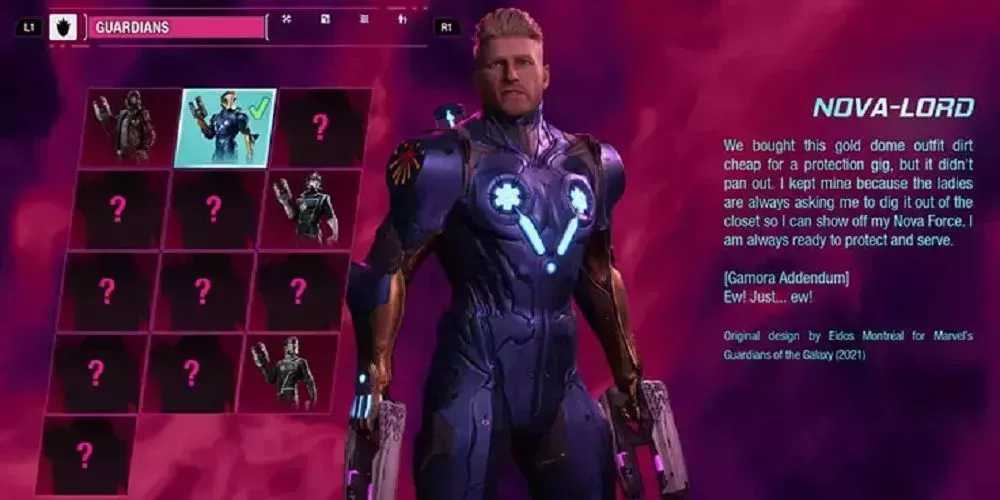 Dentro de Marvel's Guardians of the Galaxy de Eidos Montreal, Quill revela que compraron un traje de los Nova Corps para un trabajo de protección que nunca llegó a realizarse, pero eso no le impide conservar el traje para poder mostrar su... Fuerza Nova. No todos los héroes van a ser Steve Rogers.