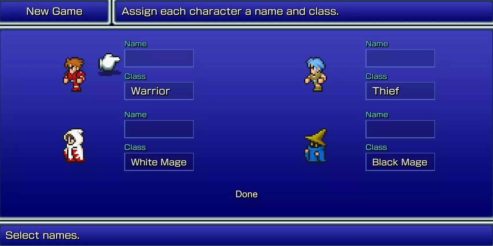 Pocos tienen el lujo de dictar su nombre, lo que a menudo puede dar lugar a un nombre poco deseable. En los títulosprincipales de Final Fantasy anteriores a Final Fantasy XII, los jugadores pueden llamar a los personajes principales (y a veces a las invocaciones) como quieran. Ese nombre puede ser el nombre canónico del personaje, el nombre del jugador, el Pokémon favorito del jugador, o algo maleducado.