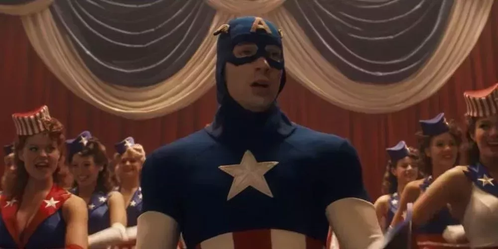 Más adelante, Steve Rogers se encuentra ante una audiencia de soldados reales y se da cuenta de lo inútil que se siente. La mayoría de la gente encuentra el montaje divertido. A otros les resulta difícil de ver. En cualquier caso, es la escena más crujiente de la película, y nunca mejora.