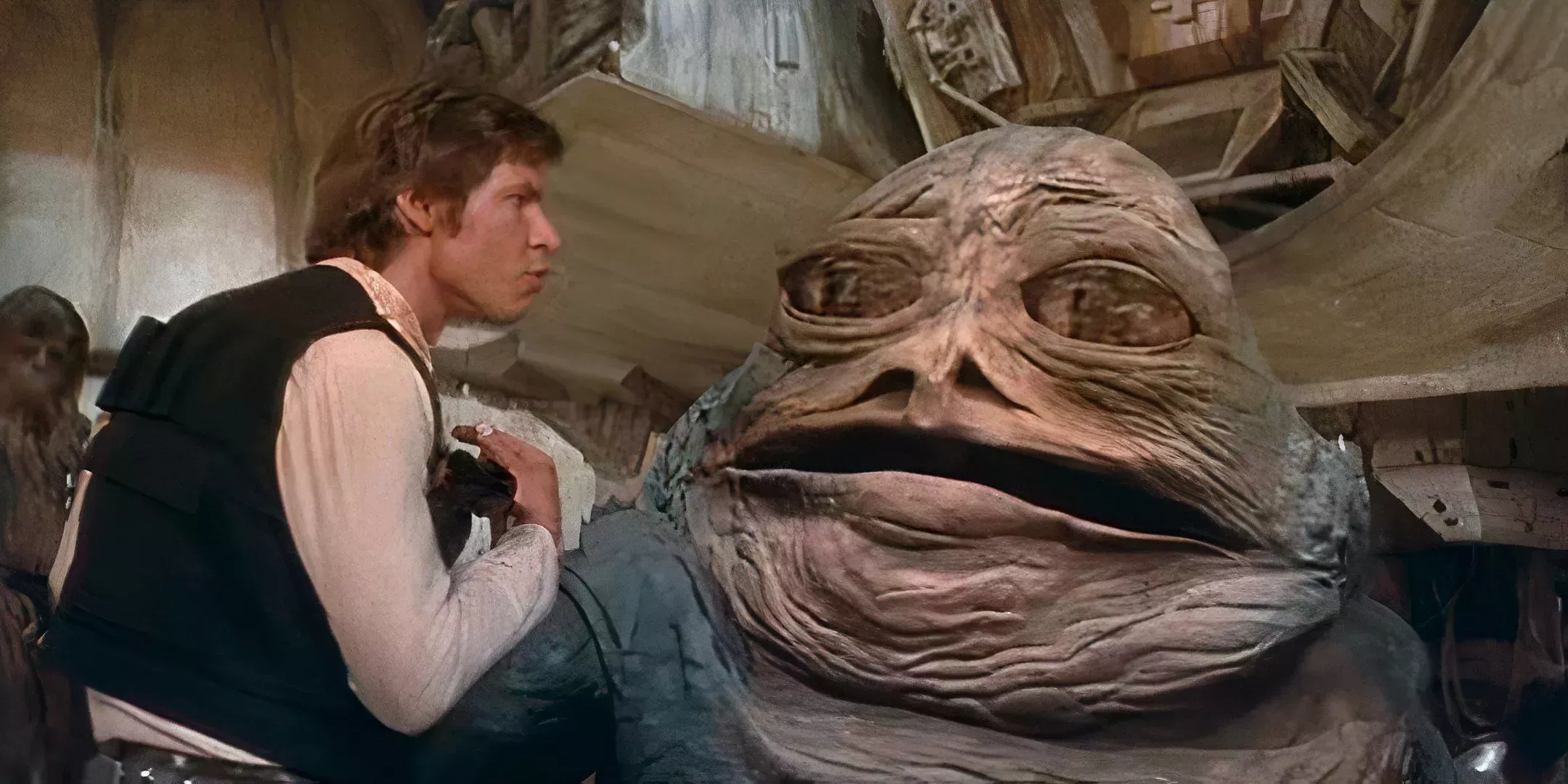 La producción de Una nueva esperanza fue, cuando menos, desastrosa, ya que George Lucas tenía ideas muy ambiciosas para la película, pero no disponía de tiempo, dinero ni tecnología que le respaldaran. El plan original de Una nueva esperanza era que Jabba el Hutt se cruzara con Han Solo y hablara con él, y en el primer montaje de la escena aparecía un actor humano, Declan Mulholland. Pero Lucas no pudo lograr su objetivo y abandonó la escena hasta finales de los 90. La segunda versión de la escena de Jabba en Una nueva esperanza contaba con un horrible modelo CGI, y aunque podría haber sido peor, el CGI y los efectos especiales habían avanzado lo suficiente en los 90 como para crear un producto mejor que Jabba el Hutt en Una nueva esperanza.
