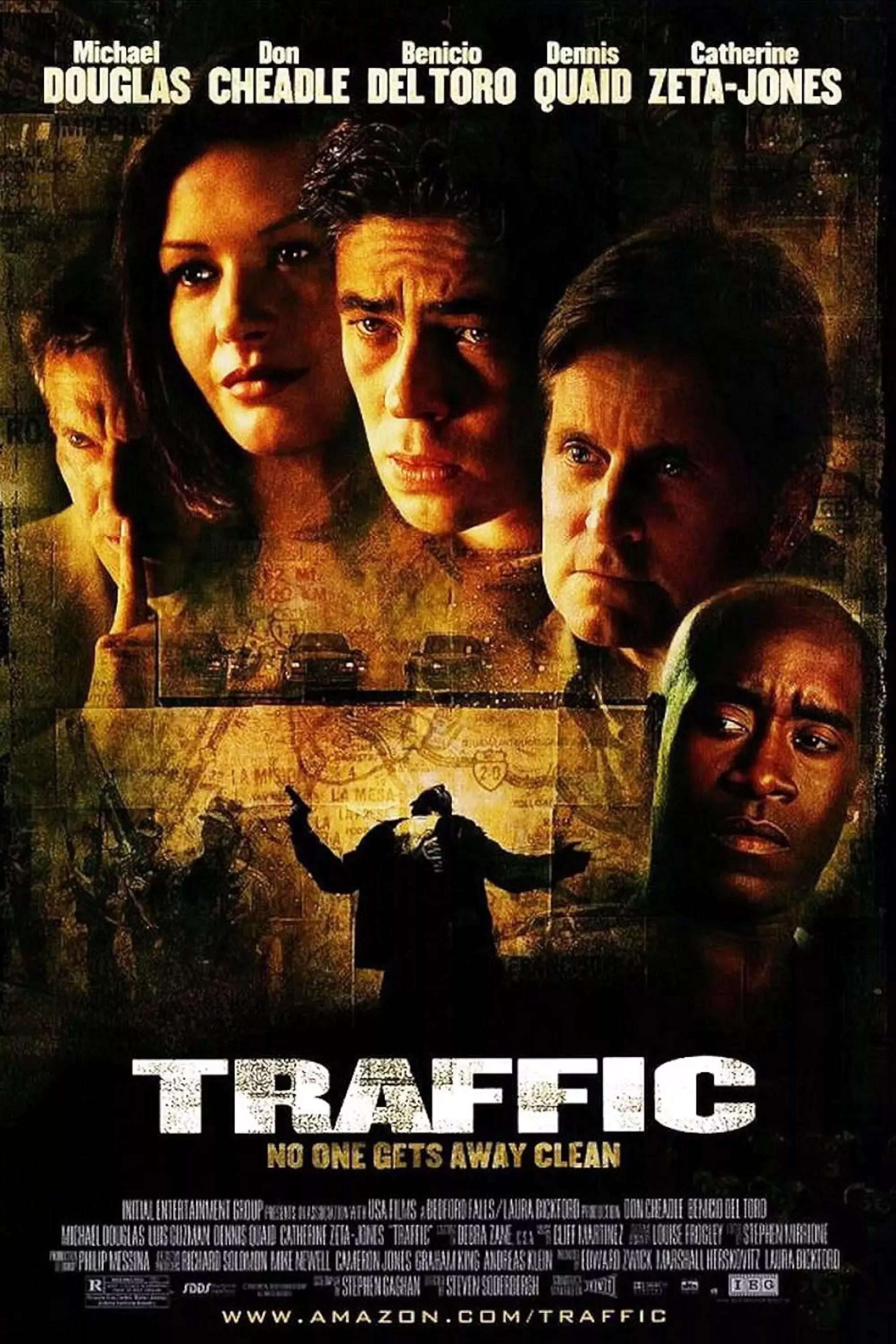 Traffic es una oscarizada visión de la cultura de la droga en el cambio de siglo, que muestra historias interconectadas de personas de todos los bandos de la Guerra contra las Drogas. Don Cheadle interpreta al agente de la DEA Montel Gordon, que va de incógnito para acabar con un gran capo de la droga. Michael Douglas interpreta al recién nombrado zar antidroga del Presidente, cuya hija es también drogadicta. Aunque sus personajes nunca interactúan, muestran cómo los distintos bandos del gobierno manejaron la Guerra contra las Drogas.