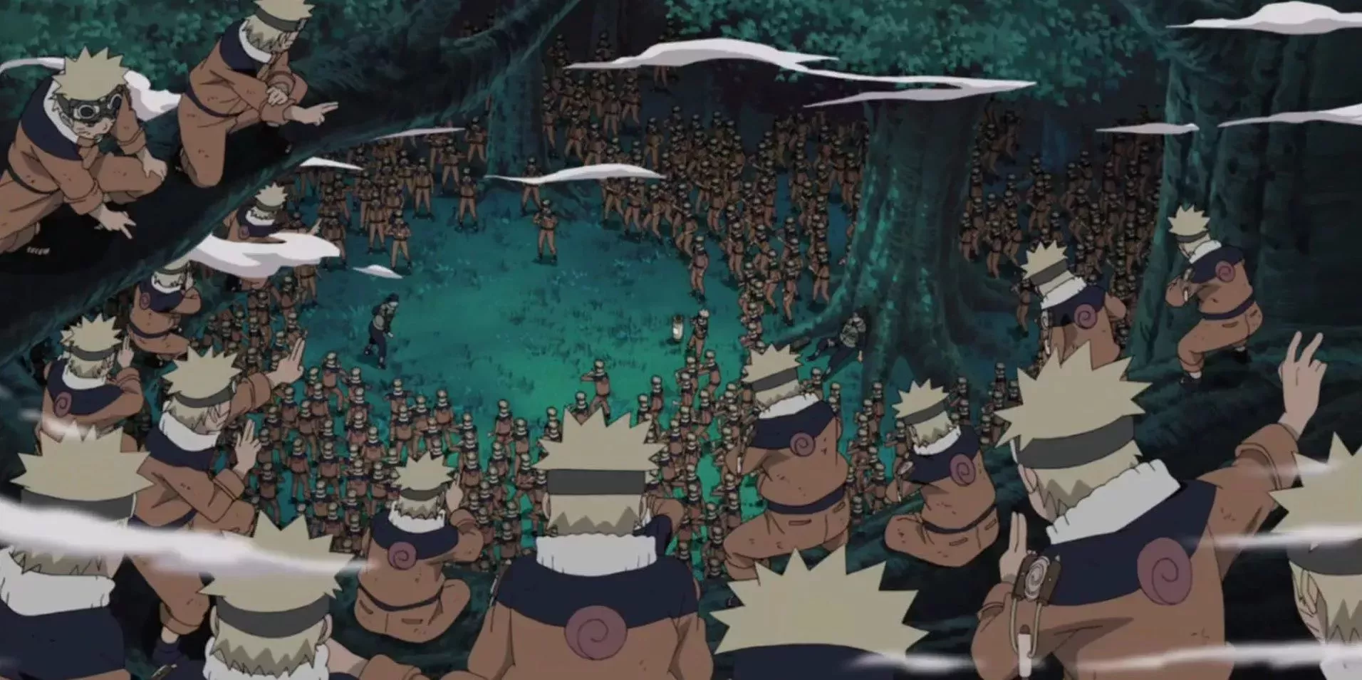 Le tocaba a Naruto salvar el día, y sólo le quedaba una opción. Leyó el pergamino prohibido que Mizuki le había pedido que recuperara, y ejecutó el jutsu Clon Sombrío por primera vez en su vida. Sin darse cuenta, Naruto se aprovechó del chakra de Kurama para crear tantos clones y, con ese ejército, sometió a Mizuki.