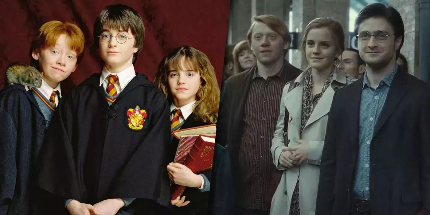 Daniel Radcliffe, Rupert Grint y Emma Watson protagonizaron los héroes del Trío de Oro. Los envejecieron ligeramente para el epílogo de la franquicia en Harry Potter y las Reliquias de la Muerte, Segunda Parte, ya que aparecieron con sus propios hijos 19 años después. Los enviaron por su propio camino mágico a Hogwarts.