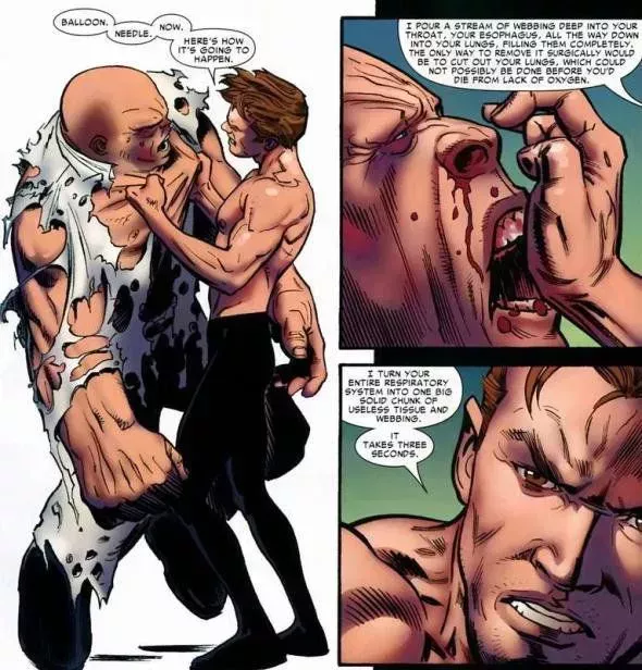 10 "Convierto todo tu sistema respiratorio en un gran trozo sólido de tejido inútil y telaraña. Tarda tres segundos. Uno...dos...tres."The Amazing Spider-Man Vol 1 #542 por J. Michael Stracynski, Ron Garney, Bill Reinhold, Matt Milla y Cory Petit