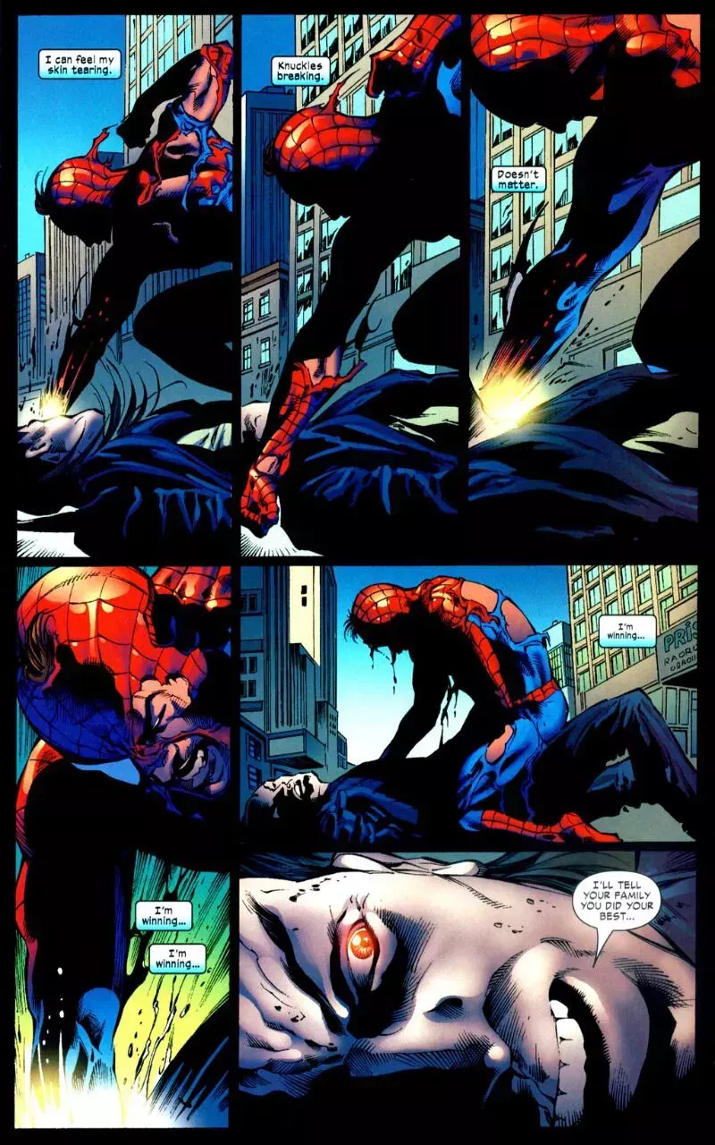 8 "Siento cómo se me desgarra la piel. Los nudillos rompiéndose. No importa. Estoy ganando".Amazing Spider-Man Vol 1 #526 por Reginald Huddling, Mike Deodato Jr., Joe Pimentel, Matt Milla y Cory Petit