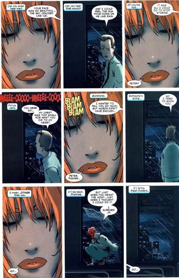 7 "Una vez dije que antes me arrancaría el corazón aún palpitante de mi propio pecho que hacerte daño. Mentí".Spider-Man: Reign #3 por Kaare Andrews, José Villarrubia y Chris Eliopoulos