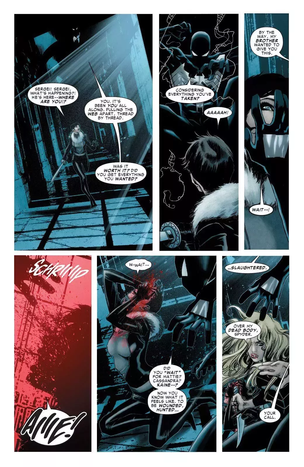 El momento más memorable deBack in Black llega cuando Spider-Man desata toda su furia contra el Kingpin, golpeando salvajemente a Wilson Fisk hasta casi matarlo. " Sabes que no hay nada que puedas hacer para detenerme", se burla Peter. "Iré hacia ti, y contaré. Uno... dos... tres. Y entonces estarás muerto". Este era el Spiderman más amenazador.