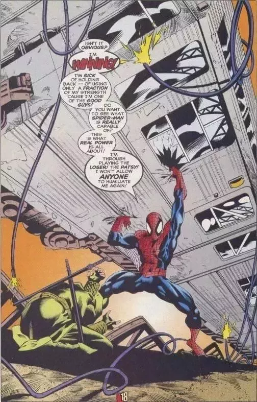 2 "¡Así es el verdadero poder! ¡Me cansé de jugar al perdedor!"Amazing Spider-Man Vol 1 #424 por Tom DeFalco, Joe Bennet, Bud LaRosa, Ralph Cabrera, Bob Shares, Richard Starkings, Comicraft, y Kiff Scholl