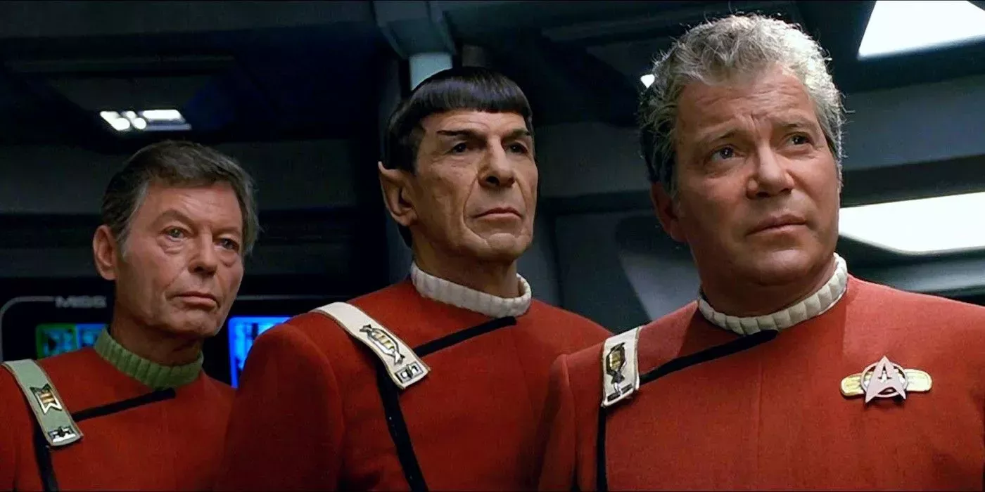 La tripulación original del Enterprise fue vista junta por última vez en Star Trek VI: The Undiscovered Country(1991), dirigida por Nicholas Meyer. Kirk (William Shatner) y el reparto celebraron 25 años de exploración de la galaxia en el canto del cisne de la tripulación y, tras múltiples escenas de emoción y acción, Kirk y el Sr. Spock (Leonard Nimoy) compartieron un momento de tranquilidad en el camarote de Spock.