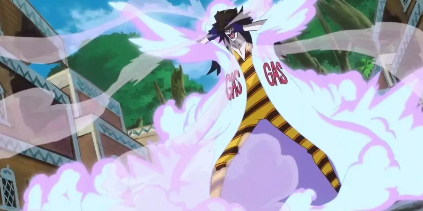 Los Sombrero de Paja encontraron por primera vez la Fruta Gas-Gas en Punk Hazard. Es una Logia que otorga a su usuario la capacidad de crear y manipular gas, y pueden transformarse en gas en cualquier momento. Como la mayoría de los usuarios de Frutas del Diablo de tipo Logia, la Fruta Gas-Gas ofrece una forma de intangibilidad, lo que significa que cualquier Pirata Barbanegra se volvería inmune a la mayoría de los ataques que no sean de Haki.