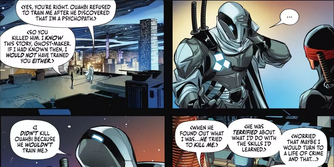 En el caso de Batman, no es de extrañar que se entrenara antes con algunos criminales. Después de todo, recibió parte de su entrenamiento del asesino David Cain. Sin embargo, nunca se ha especificado quién entrenó tanto a Batman como a Ghost-Maker. Al principio del primer arco argumental de Batman Incorporated, Ghost-Maker explica que se entrenó con varios criminales para adquirir algunas de sus habilidades.