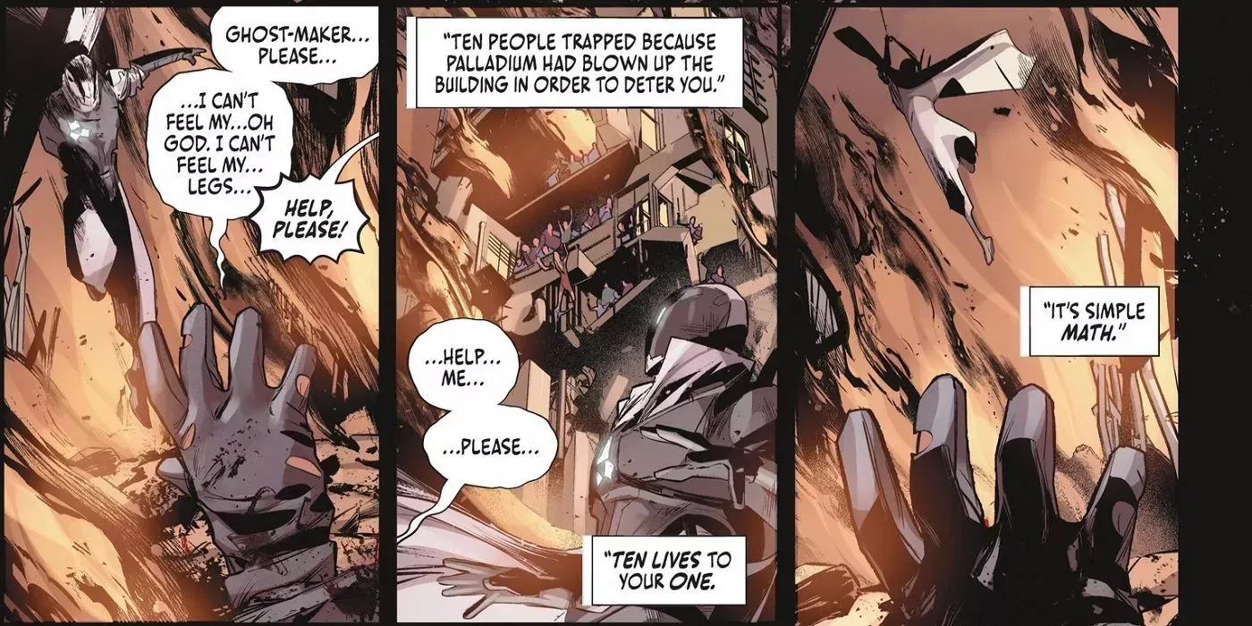 Aunque Ghost-Maker quería salvar a Phantom-One, al final se dio cuenta de que había más vidas en juego que debían salvarse. Vidas que no tenían nada que ver con lo que había hecho Phantom-One. Aunque no era la decisión que Batman habría tomado, Ghost-Maker optó por salvar al mayor número de personas posible al final.