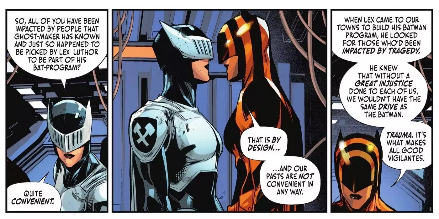 Lex decidió que la razón clave para que alguien resistiera tanto el entrenamiento como el trabajo de convertirse en justiciero era que hubiera sufrido una gran injusticia. Aunque eso es algo que empujó a Batman a ser la persona que es, sólo significaba que el nuevo grupo de Lex estaba claramente más enfadado que el grupo original de Batman Incorporated.
