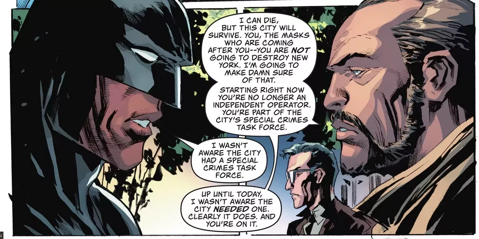 La policía de Nueva York creó un grupo especial para trabajar con Batman. Algunos fans podrían argumentar que hacer de Batman un brazo de una fuerza policial casi tan corrupta como la de Gotham podría hacer que Jace fuera mucho menos genial que el Batman original. Sin embargo, esta evolución le hace destacar.