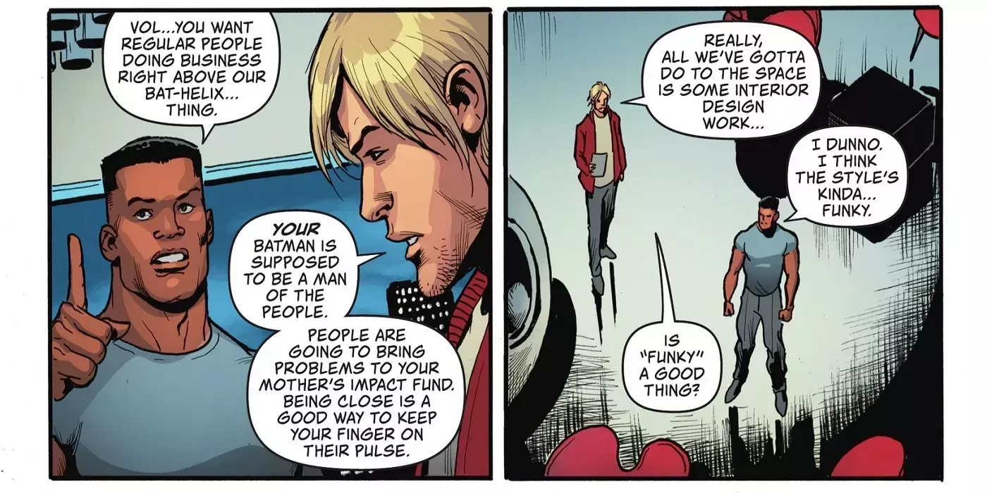 El Helix tiene todo lo que Jace y Vol necesitan para operar, desde una conexión con los túneles del metro hasta plantas especiales que pueden cerrarse con llave. Aún más audaz es la sugerencia de Vol de convertir la planta baja del Helix en otra oficina para que la madre de Jace haga su trabajo benéfico. No es nada que se le hubiera ocurrido a Bruce, pero encaja con la idea de Jace de estar con la gente.