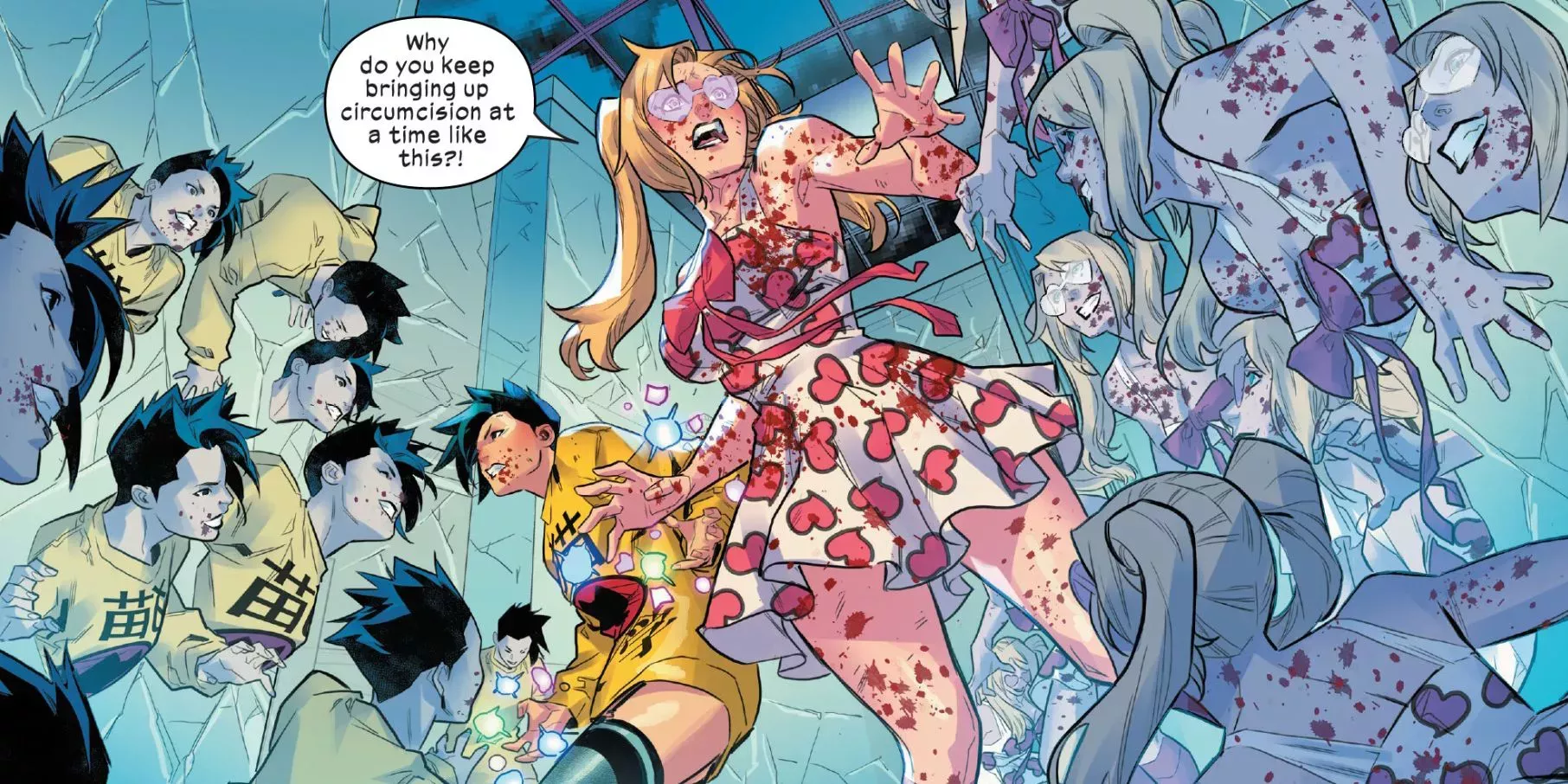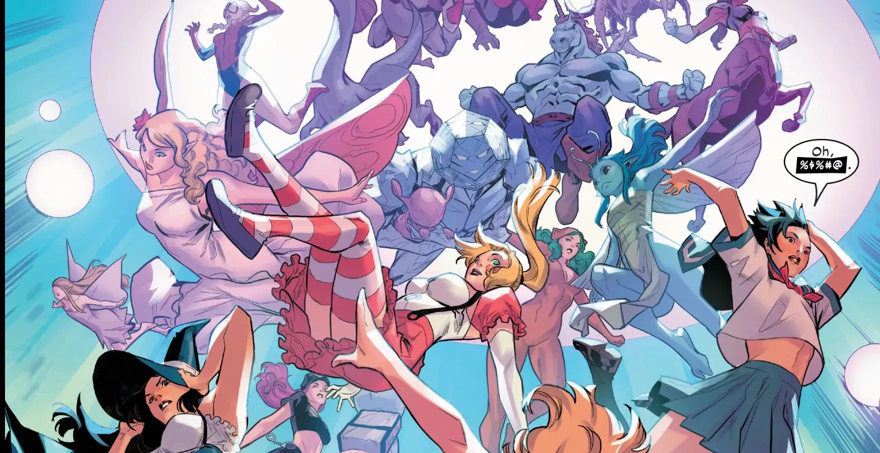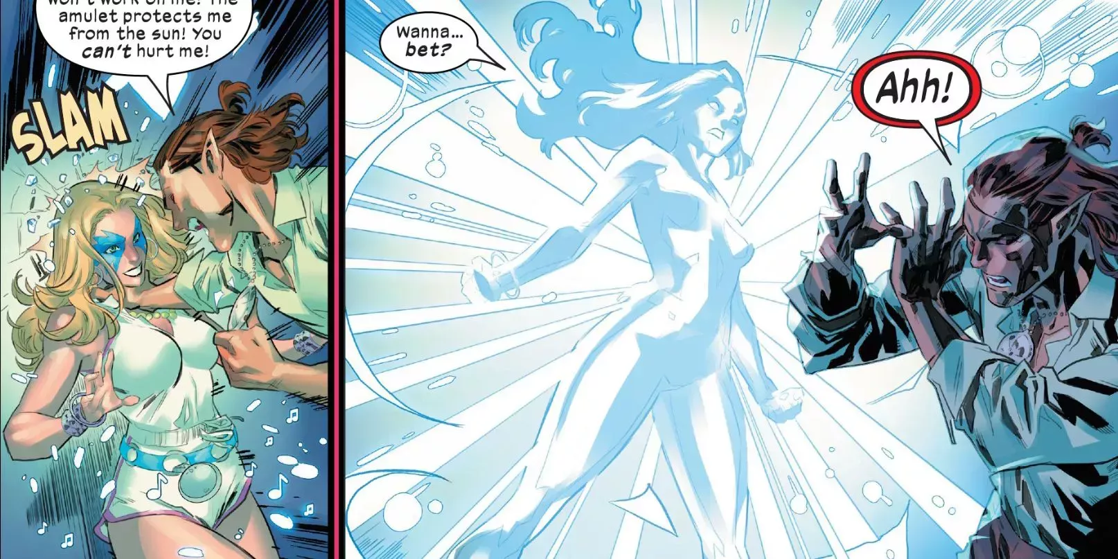 Las mujeres tenían problemas para escapar de los encantamientos de hadas que las atrapaban, pero seguían de buen humor. Dazzler, Jubilee y Boom-Boom se burlaban entre ellas mientras se abrían paso a través de clones mágicos, vampiros depredadores y cualquier otra cosa que se interpusiera en su camino. Mientras tanto, Dazzler ideó un plan para combinar sus fuerzas con las de Boom-Boom.
