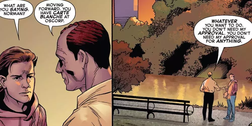 Antes de los acontecimientos del Duende de Oro, Norman salvó la vida de Peter Parker y le ofreció de buena fe un trabajo en Oscorp. Esto permitiría a Peter ganar algo de dinero y ayudaría a Norman a mantenerse en el buen camino tras la limpieza. Al principio de la serie, mientras Norman luchaba contra su sentimiento de culpa, se distraía con el trabajo. Norman presionaba mucho a Peter Parker y se implicaba demasiado cuando no era necesario.