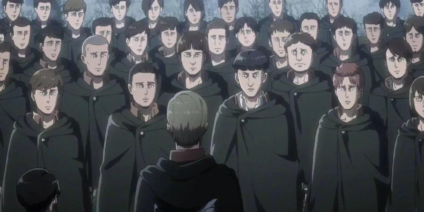Como era de esperar, a todos les aterrorizaba la idea de tener una muerte sin sentido. Erwin les motivó afirmando con franqueza que, aunque sus muertes no significaran nada en ese momento, debían confiar la búsqueda de un propósito a aquellos a los que iban a morir protegiendo. Las palabras de Erwin calaron hondo, y él y sus soldados murieron cumpliendo sus deberes por última vez.
