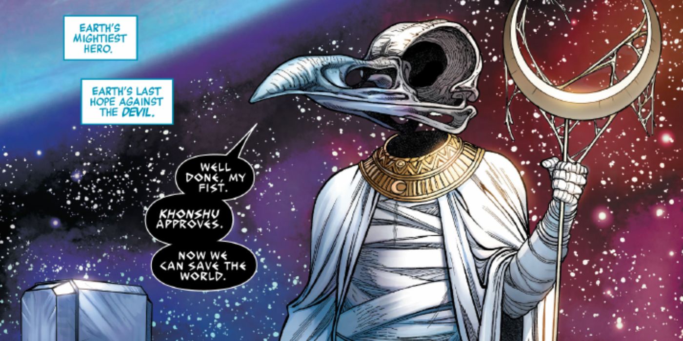 Durante la reciente historia de la "Edad de Khonshu", el Caballero de la Luna aprendió que el precio de servir al Dios egipcio de la Luna y la Venganza tiene un precio más alto de lo que nunca imaginó. Para salvar al mundo, robó los poderes del Espíritu de la Venganza, el Puño de Hierro, e incluso el martillo del Vengador más poderoso de Marvel, llevándolos al espacio y entregando estos artículos a Khonshu, para consternación del resto del mundo.