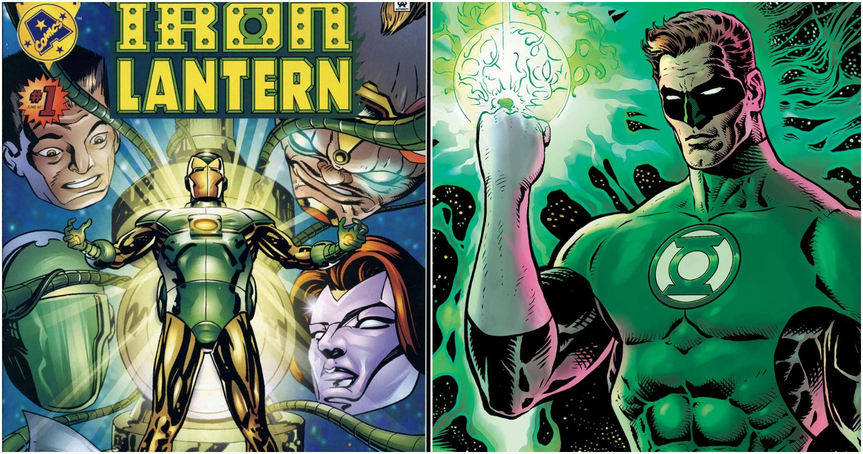 Si usted pensó que Star Trek/Linterna Verde era un cruce poco probable, espere hasta que vea la Linterna de Hierro. Como su nombre indica, la Linterna de Hierro es una amalgama de Tony Stark y Hal Jordan. IL proviene del Universo Amalgama - una realidad alternativa que está llena de fusiones de famosos héroes de Marvel y DC Comics.