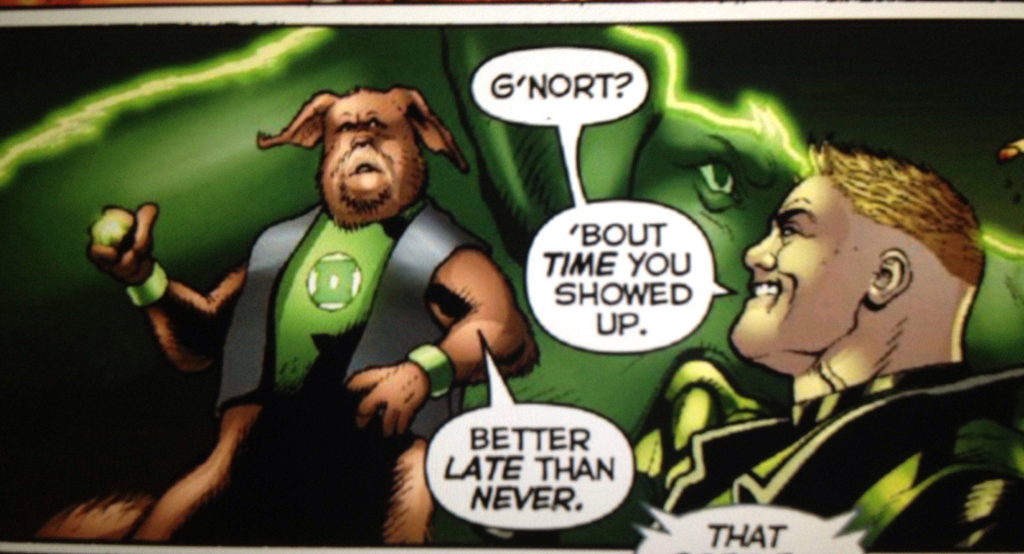 G'nort es otro personaje con una historia realmente enrevesada. En términos simples, G'nort es un perro humanoide que fue aceptado en el Green Lanter Corps por accidente. La extrañeza no se detiene con la historia del origen de G'nort; en realidad es el primo de Larfleeze, el Linterna Naranja.