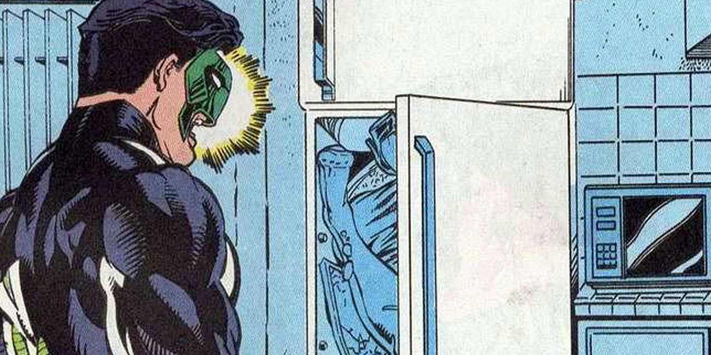 Estamos entrando en el territorio de la edad oscura de los cómics, queridos lectores. Prepárense y saquen el peróxido de hidrógeno porque las cosas están a punto de ponerse feas. Durante la década de 1990, el dibujante de cómics convertido en Green Lantern Kyle Rayner estaba haciendo olas como un amante divertido y amable sucesor de Hal Jordan. DC quería añadir más drama al personaje de Rayner, así que decidieron hacer que el Mayor Force matara a la novia de Kyle y dejara sus restos en el refrigerador de la pareja.