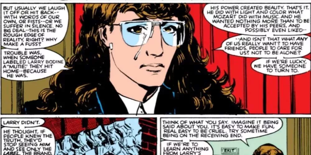 Los Nuevos Mutantes lo rechazan, pero sin que ellos lo sepan, Larry es en realidad un mutante y estaba tratando de encajar con lo que él creÃa que eran adolescentes normales. Larry se quita la vida, dejando a Kitty y a sus amigos destrozados por la culpa. Los Nuevos Mutantes se enfrentan a la tragedia, cada uno a su manera, y el número culmina con Kitty dando uno de los mejores discursos de toda la historia de los X-Men en el funeral de Larry.