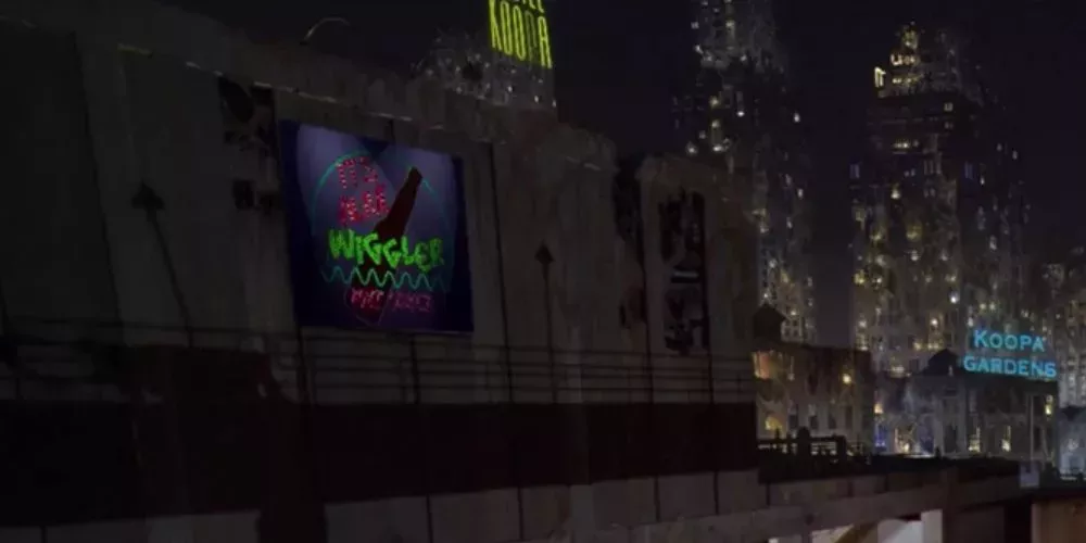 También hay un cartel de neón de una tienda llamada "Thwomps" que vende los mencionados Thwomp Stompers, que es el escenario de una rápida escena de acción hacia el final de la película.