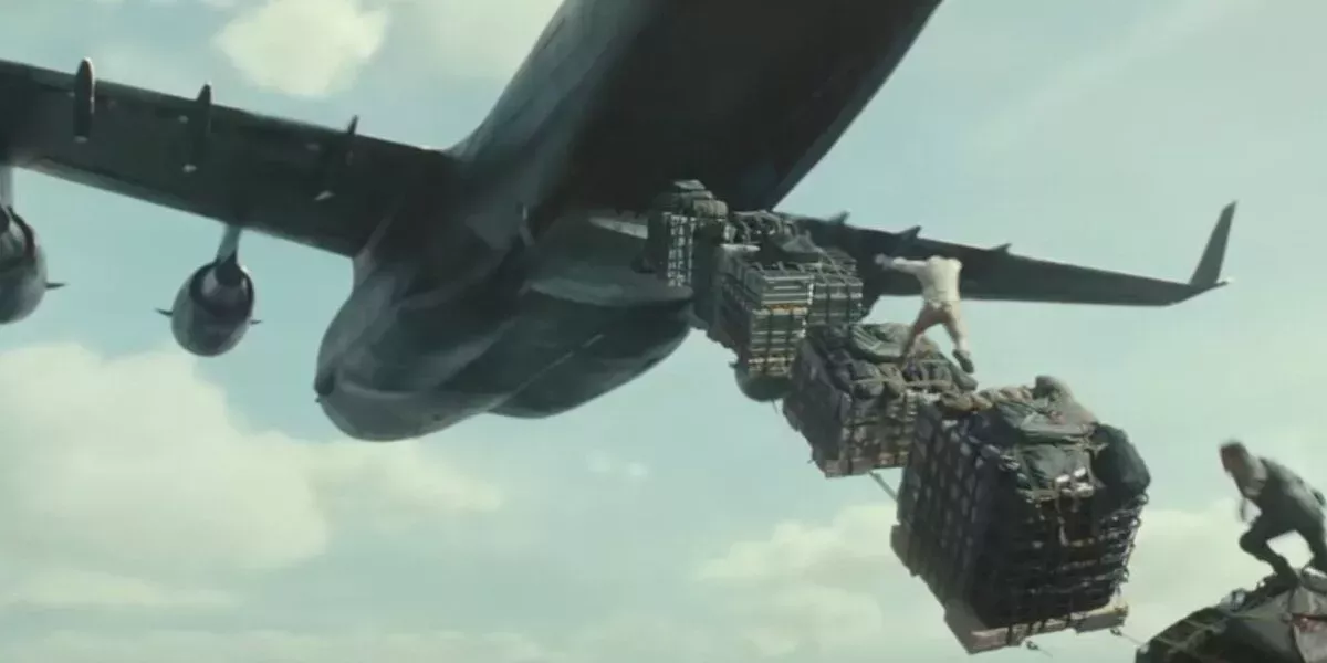 Uncharted se abrió con una escena que recuerda a la de Uncharted 3: Drake's Deception. Presentaba a Nate despertando en el aire mientras está atrapado en la red de una caja de carga y colgando de un avión, para luego subir. Era una clara conexión con los videojuegos.