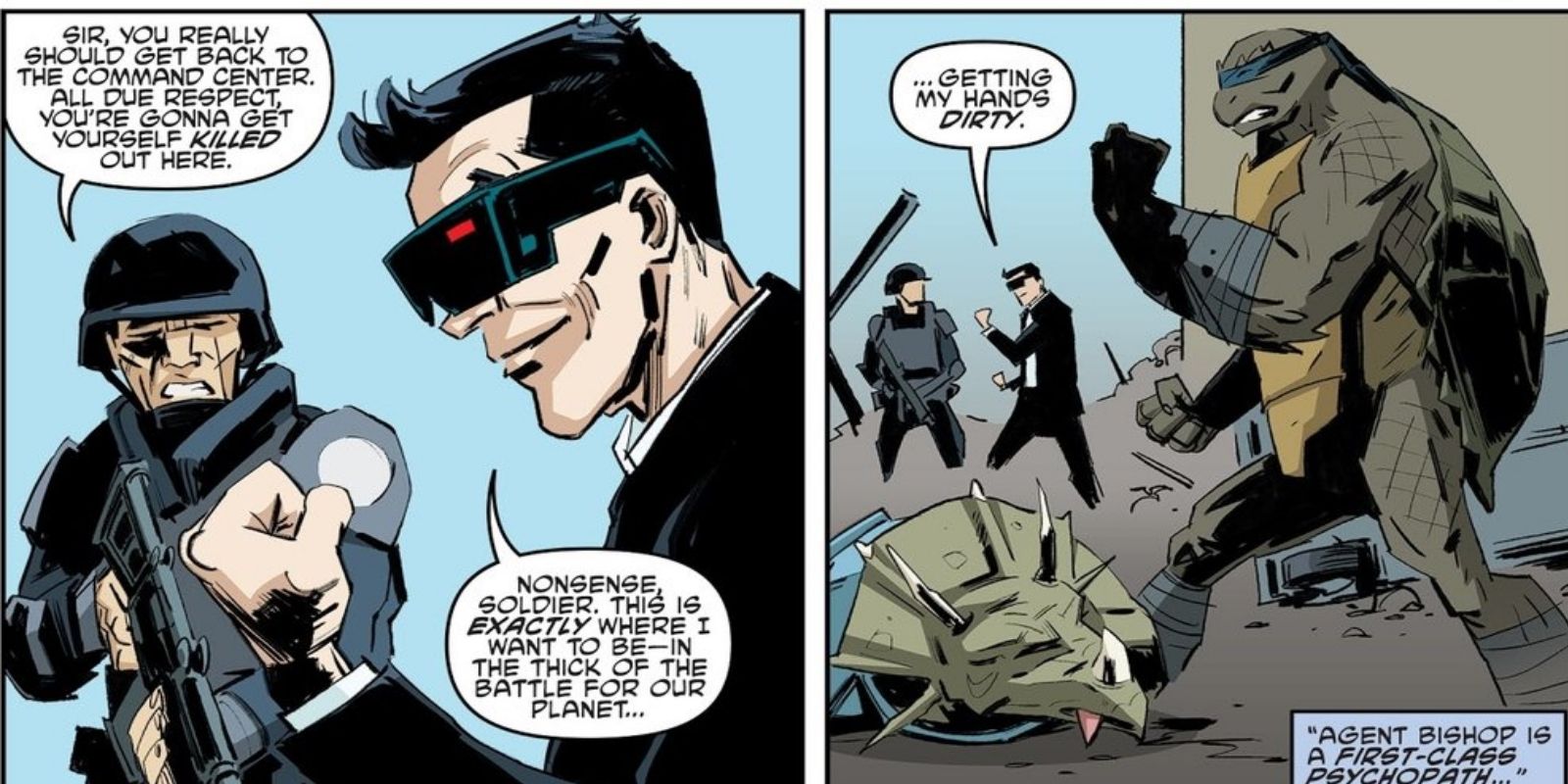 John Bishop es uno de los personajes más malvados del universo de las tortugas. Cualquier humano que pueda derrotar a nuestros cuatro muchachos solo y con las manos vacías merece tener su propia película. John Bishop es un agente especial del gobierno de Estados Unidos y es el jefe de la Fuerza de Protección de la Tierra, donde trabaja para proteger a la Tierra de razas alienígenas con malas intenciones.