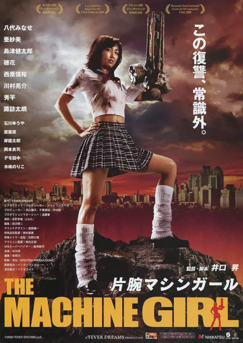 En The Machine Girl, el mundo de una huérfana se hace añicos cuando los ninjas Yukaza matan a su hermano y le cortan la mano. Por suerte, unos mecánicos de coches se apiadan de ella y le fabrican una ametralladora Gatling para que pueda vengarse. Uno a uno, acaba con la familia del sindicato del crimen con una combinación de sangriento kárate y disparos de ametralladora.