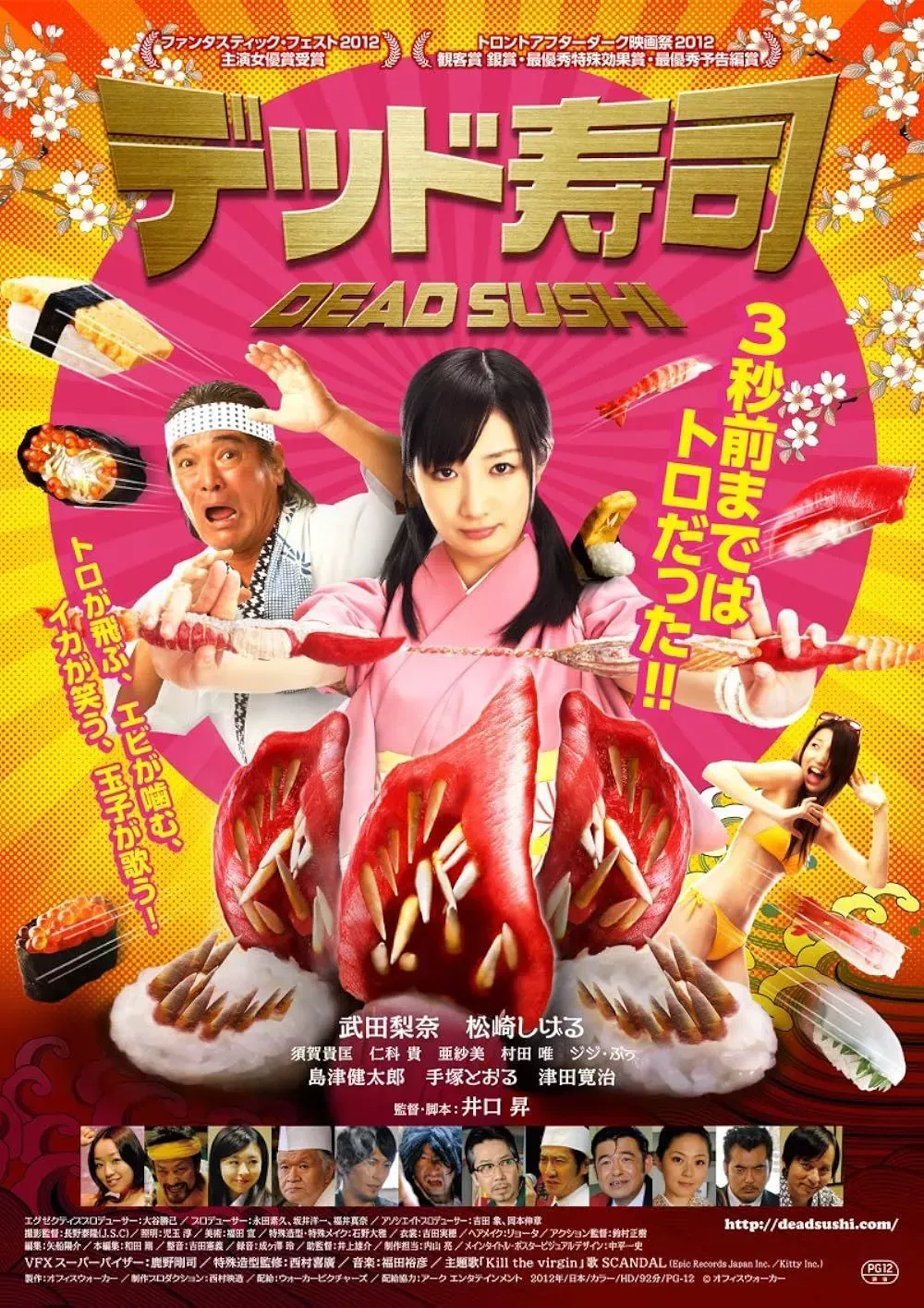 Rina Takeda es una auténtica campeona de artes marciales que ha pateado traseros en películas como Karate Girl y Danger Dolls. En Dead Sushi, interpreta a la hija de un famoso chef de sushi que no puede cumplir las expectativas de su padre. Acepta un trabajo en una posada rural, pero, por desgracia, una toxina ha convertido las piezas de sushi en minimonstruos voladores asesinos.