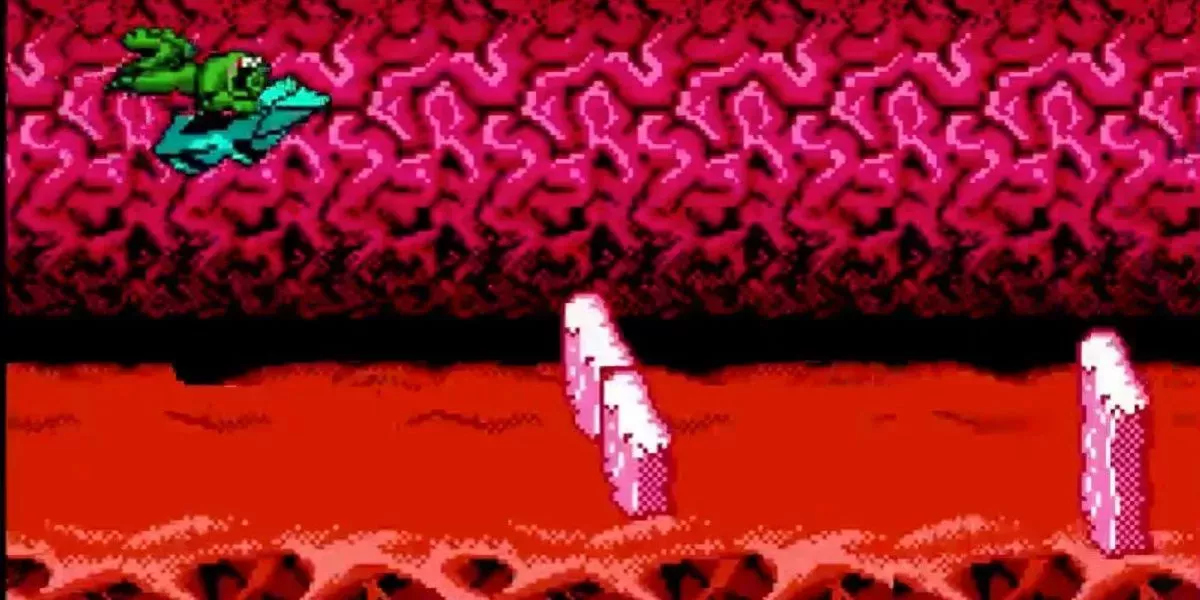 Battletoads para NES es un juego que podría haber sido divertido si no hubiera estado diseñado de forma tan sádica. El primer nivel engaña a los jugadores haciéndoles creer que el juego es un beat 'em up caricaturesco. El segundo nivel es un lento descenso por un pozo lleno hasta los topes de enemigos y peligros que pueden matar a los sapos al instante.