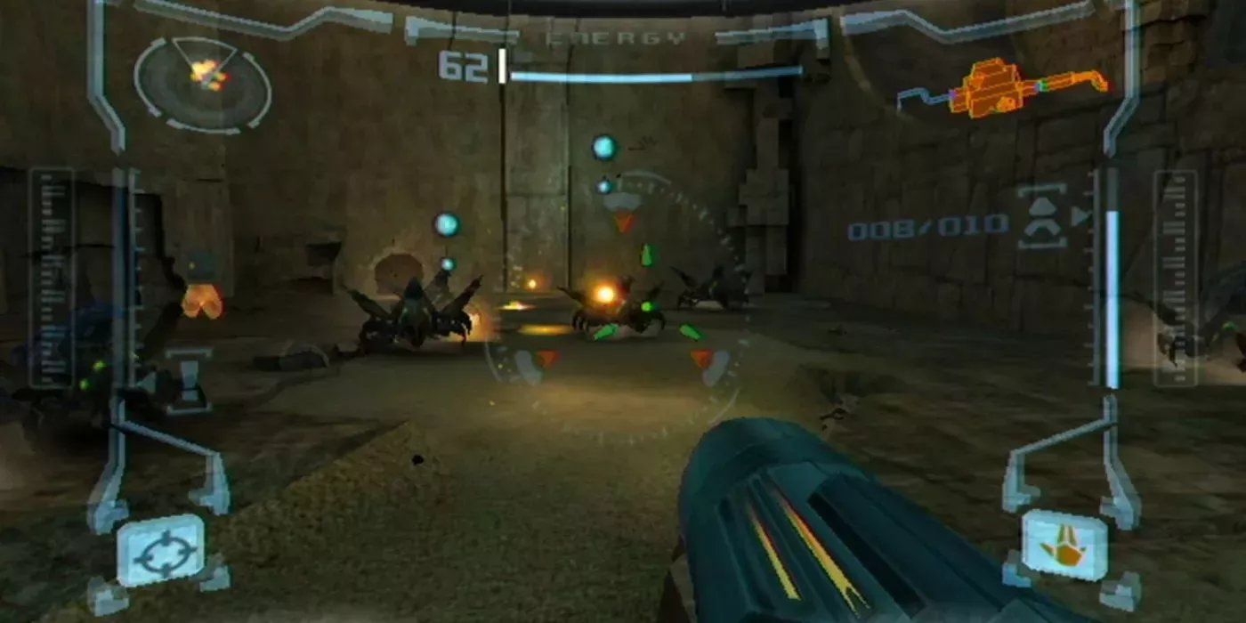 La trilogía Metroid Prime de Nintendo hace que los jugadores vean el mundo como lo hace Samus, con la perspectiva de la cámara dentro de su visor dentro de su casco. Toda la información necesaria en cada momento se muestra en la pantalla, como si se tratara de los diagnósticos de un traje de combate real. Casi todo está en el HUD y rara vez hay algo que hacer fuera del juego, aparte de hacer una pausa o mirar el mapa. El escaneo también es una característica clave en los juegos y el hecho de que la información salga de todo lo que se escanea aumenta la inmersión, ya que se leen y descubren cosas como las que descubre Samus.
