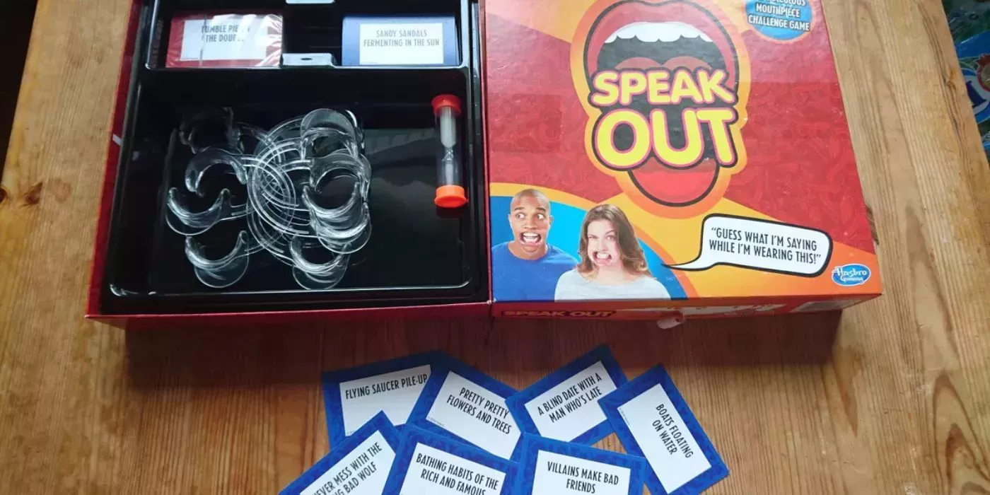 En Speak Out, los jugadores deben robar una carta y decir la frase que aparece en ella mientras un temporizador realiza la cuenta atrás. Parece bastante fácil, salvo que el jugador lleva una boquilla que le impide cerrar completamente los labios o formar sílabas adecuadas.