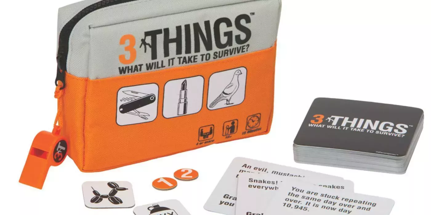 Cuando los jugadores se ven inmersos en un ridículo escenario de supervivencia, deben elegir tres cosas que les ayuden a elaborar un plan de supervivencia. En 3 Cosas, los jugadores roban una carta con un escenario extraño. Luego tienen 30 segundos para elegir tres cosas de entre 80 cartas y elaborar su plan.